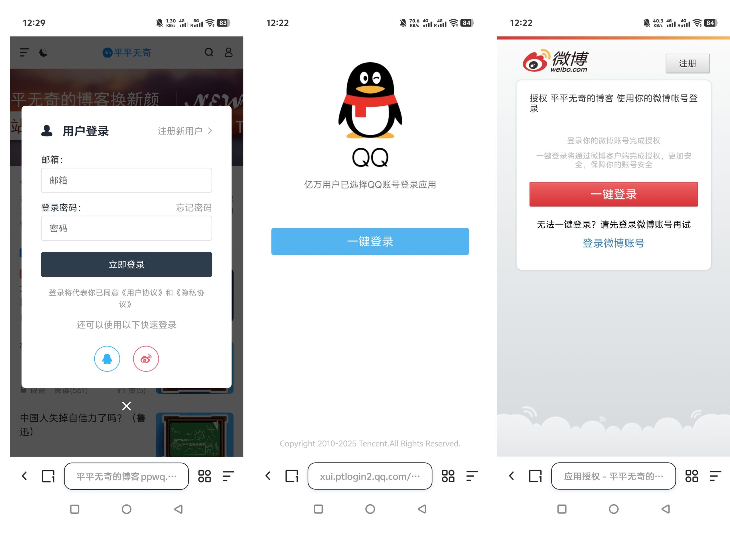 本文于 2025-11-19 12:45 更新,已是最新版。 本站已支持用QQ或者微博账号快速登录,手机和电脑端均可用,这是对原有邮箱注册登录的重要补充,今后登录本站会更加便捷。 PC端的QQ和微博账号登录界面 手机端的QQ和微博快速登录 -=||=-收藏赞 (0)